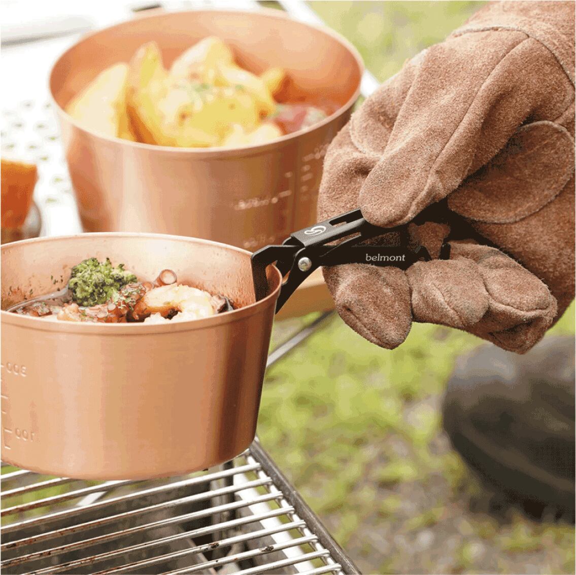 簡単な上げ下ろしは前側、長時間持つときは後側を使い、湯煎したパウチなども持ち上げることができます。