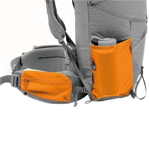 両サイドにあるストレッチポーチには、ウォーターボトル、トレッキングポールなど、ヒップベルトにあるジッパー式ストレッチポケットには、携帯電話などの小物をすばやく収納できます。