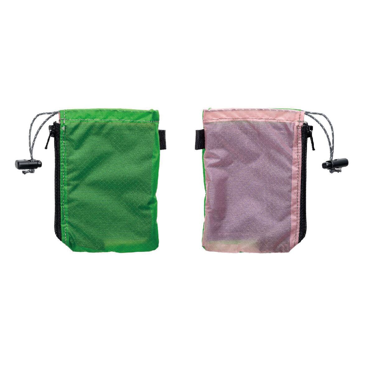 財布として札、カード類をセパレート収納ができ、ドローコードを緩めれば小銭の確認もできるためミニマリストに使ってもらいたい一品。